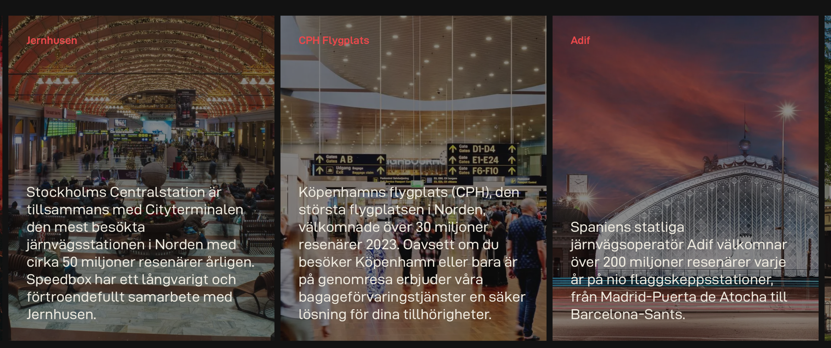 Sedan 1958 har Speedbox vuxit frÄn sina rötter i plÄt till att bli Europas ryggrad nÀr det gÀller förvaring av bagage och betjÀnar jÀrnvÀgsknutpunkter, flygplatser, parker och hamnar. Som ett privatÀgt svenskt företag har Speedbox revolutionerat bagageförvaringsbranschen med tillförlitliga och sÀkra lösningar för rese- och hotellbranschen. De Àr en innovationsdriven, lösningsfokuserad organisation som strÀvar efter att stÀndigt omdefiniera förvaringslandskapet. Speedbox betjÀnar bÄde hotell- och resesektorn och tillhandahÄller innovativa lösningar för att möta marknadens behov.